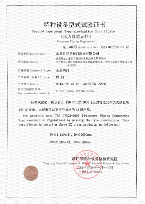 特種設備型式試驗證書